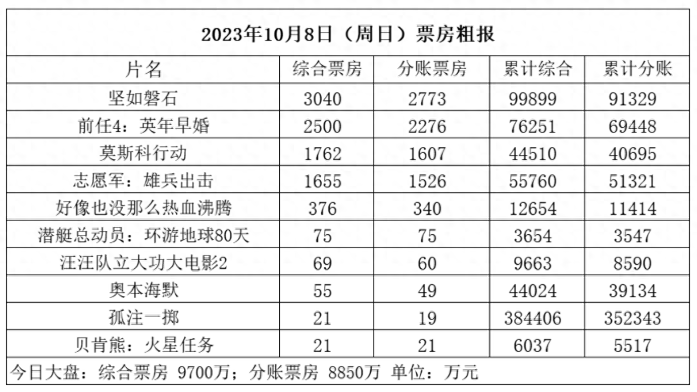 10月8日(周日),全国共排映35.2万场,观影人次约230.8万,根据初步统计产出票房9700万。