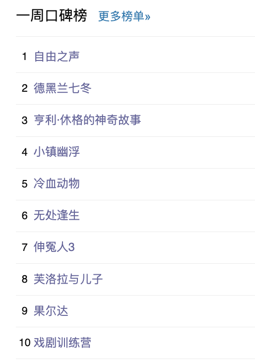 最后,还是例行附上一周豆瓣口碑榜的完整榜单: