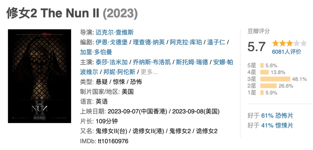 比如,恐怖片《修女2》