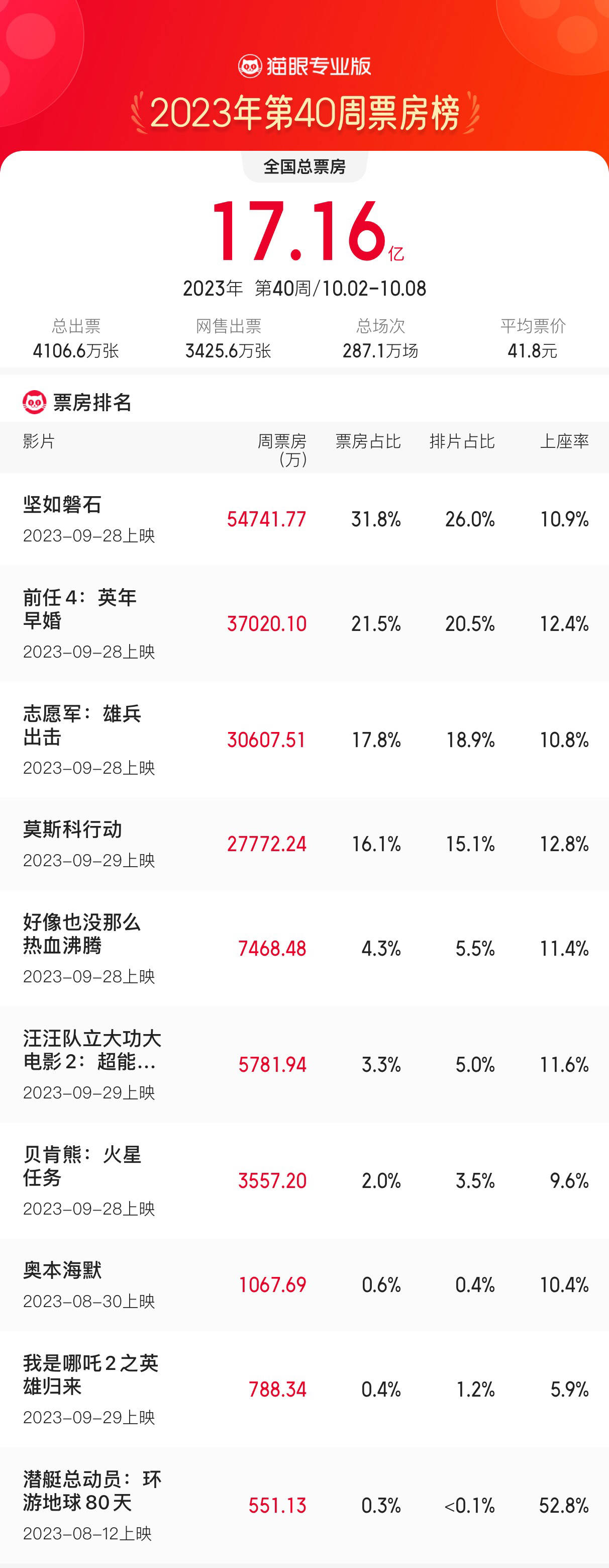 原标题:10.2-10.8一周横跨国庆档报收17.16亿 《坚如磐石》5.47两连冠累计票房9.98亿