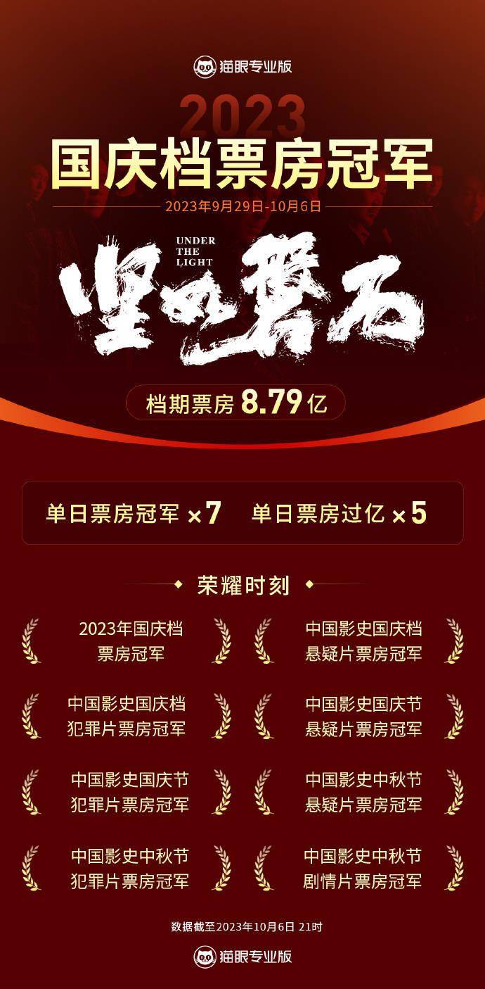 国庆档电影《坚如磐石》自上映以来,连续7日夺得单日票房冠军,连续5天单日票房过亿,票房一路高涨,在张艺谋导演的加持下,影片好评如潮,极具风格化的艺术影像,“叔圈”严选的演员阵容,都制造了强大的话题性,讨论度极高。最终,该片勇夺2023年国庆档票房冠军。