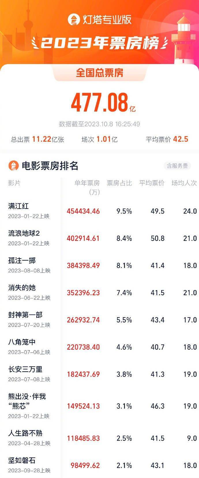 1905电影网讯10月8日,灯塔专业版数据显示,电影票房超过9.85亿,超过影片,进入2023内地电影票房榜第十名。目前,影片累计观影人次超2280万,至此今年内地票房前十名全部是国产影片。