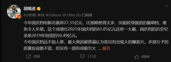 同时,他还批评道:“在总结、报道国庆票房情况时,一些主流机构号突出了27亿这个大数,或者与情况糟糕的去年国庆档对比,而刻意回避了2021年和2019年的比较角度。网上对几部片子的评论也都是夸的多,对它们票房不理想的原因触及得少,文艺批评的力度显然不够。至于其他成绩单,也存在类似问题。”