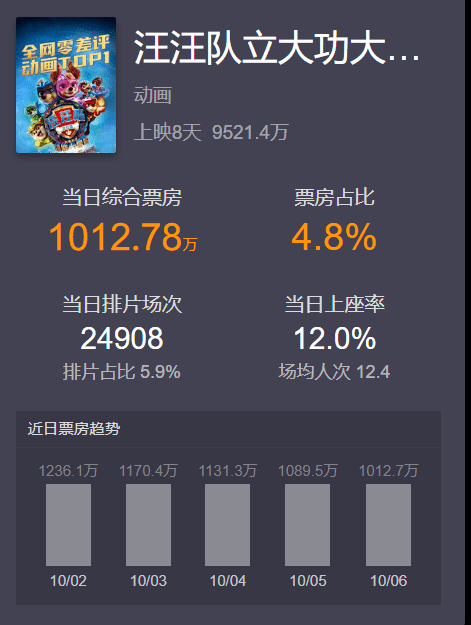暑期档的热络,让部分业内人士对国庆档也抱有好的预期(40亿)。不过在国庆档即将来临之际,其实不少人也都调低了预期。12部新片没有出现票房破10亿的黑马,6部动画片均没能突破1亿元大关,只有3部超过一千万元,分别为《汪汪队立大功大电影2:超能大冒险》的9518万元、《贝肯熊:火星任务》的5789万元和《我是哪吒2之英雄归来》的1477万元。没有“爆款”的国庆档,开启了10月的电影市场。