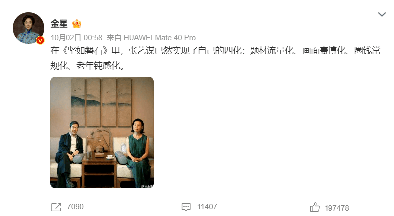 10月2日凌晨0点58分,影星金星在微博发文称,在《坚如磐石》里,张艺谋已然实现了自己的四化:“题材流量化、画面赛博化、圈钱常规化、老年钝感化。”她的言论引起广泛热议。10月5日,作家六神磊磊就金星的批评,在微博反驳《坚如磐石》是“流量化”“圈钱化”或者是“老年钝感”。他认可了张艺谋在表达尺度上的探索,称看到了这里面的勇气和价值。目前,《坚如磐石》官方未对金星的言论做出回应。