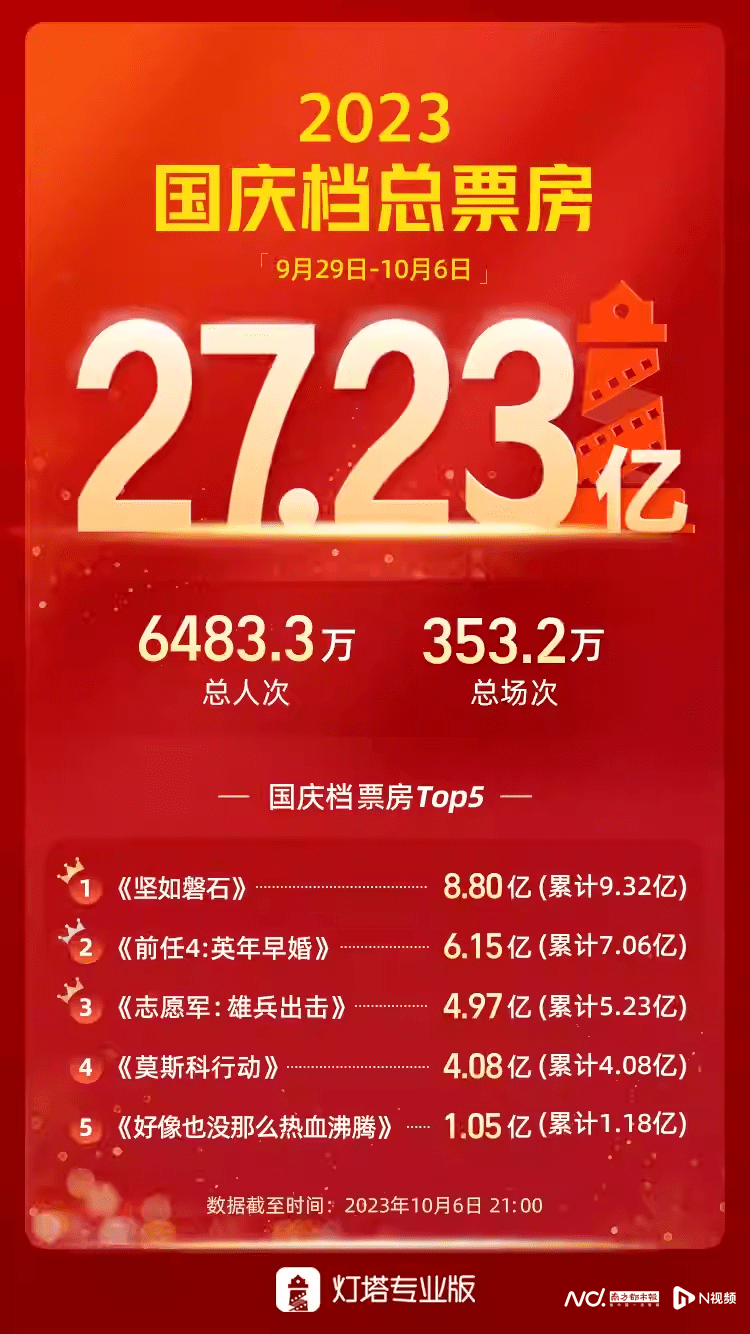 据灯塔专业版实时数据,截至10月6日21时,2023年国庆档总票房达27.23亿,影片《坚如磐石》成今年国庆档票房冠军,《前任4:英年早婚》《志愿军:雄兵出击》分列二三位。