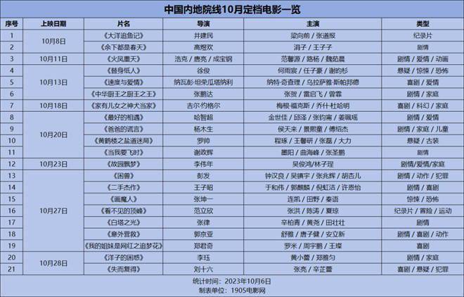 1905电影网专稿 2023年国庆档圆满收官!长假渐渐离我们远去,但影市热情却未曾褪减。超20部新片即将“补货”10月影市,涵盖爱情、动作、悬疑、犯罪等多个题材类型。