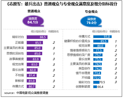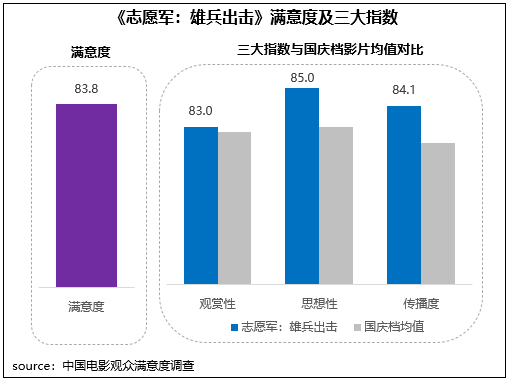 《志愿军:雄兵出击》满意度三大指数表现相对均衡,是档期内三大指数均超83分的两部影片之一(另外一部为《93国际列车大劫案:莫斯科行动》)。