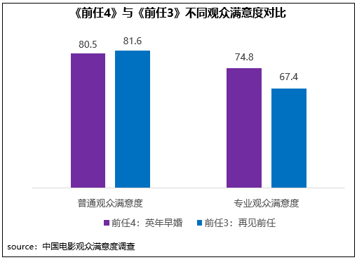 由田羽生执导,韩庚、郑恺主演的都市爱情轻喜剧电影《前任4:英年早婚》观众满意度80.1分,与六年前上映的系列上一部《前任3:再见前任》相差不大,略下降0.6分;其中二者思想性得分几近持平,观赏性下降了2.3分。