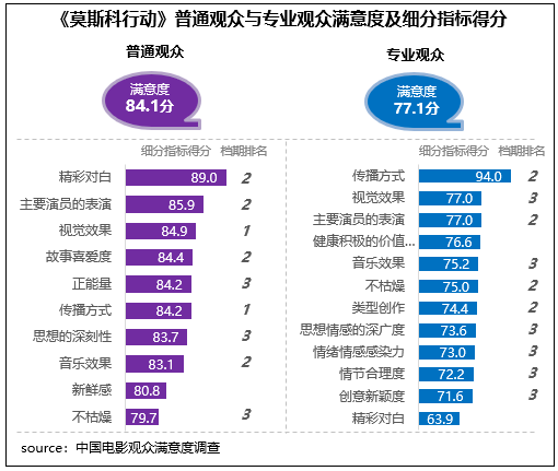 在不同观众评价上,《莫斯科行动》相对更受普通观众青睐,普通观众满意度得分84.1分,居档期第二位,与《坚如磐石》相差0.1分;专业观众满意度得分77.1分,居档期第三位。