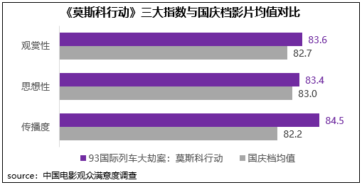 《莫斯科行动》根据上世纪90年代跨境追捕抢劫案犯案件改编,在真实社会事件基础之上有机融入商业化要素,三大指数得分均超83分;其中传播度得分84.5分,居档期首位,影片延续邱礼涛导演的动作类型片风格,#莫斯科行动是纯血类型片#词条登上微博热搜,影片突出的硬核热血气质引热议。