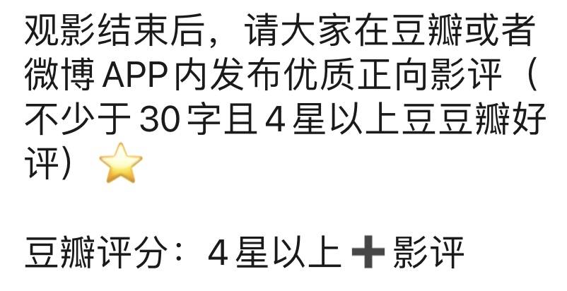 离职后,巧巧也参加了别的观影团。观影结束后,主办方在群里发了一条很长的公告,希望大家在规定时间内评论,要求双平台、有字数规定、需要四星以上。如未反馈评分截图,主办方还会在群里催促。