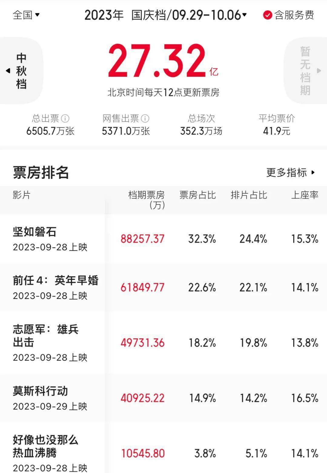 据猫眼专业版统计,2023年国庆档总票房27.32亿元。其中,分别以8.82亿元、6.18亿元、4.97亿元、4.09亿元、1.05亿元,位列档期新片票房排行榜前五名。