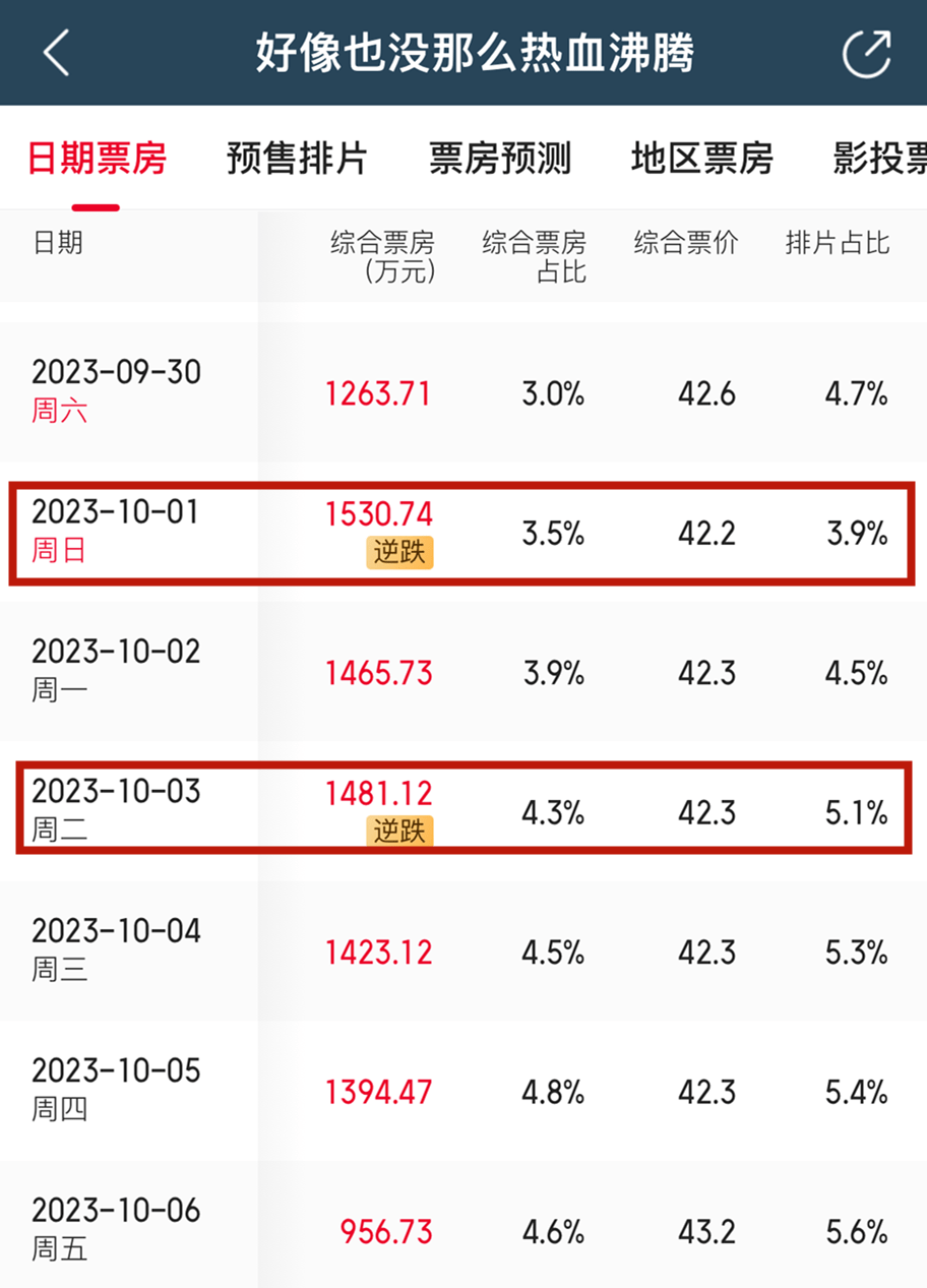 单片方面,《坚如磐石》《莫斯科行动》《好像也没那么热血沸腾》均有单日票房逆跌现象出现。其中,《好像也没那么热血沸腾》档期内单日票房逆跌次数最多达到两次,分别为10月1日、10月3日。