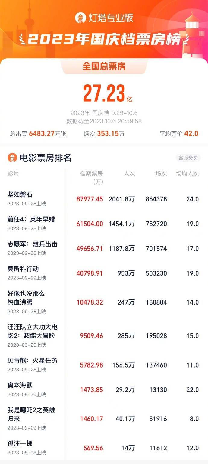 原标题:2023国庆档票房定格27.23亿 《坚如磐石》成票房冠军