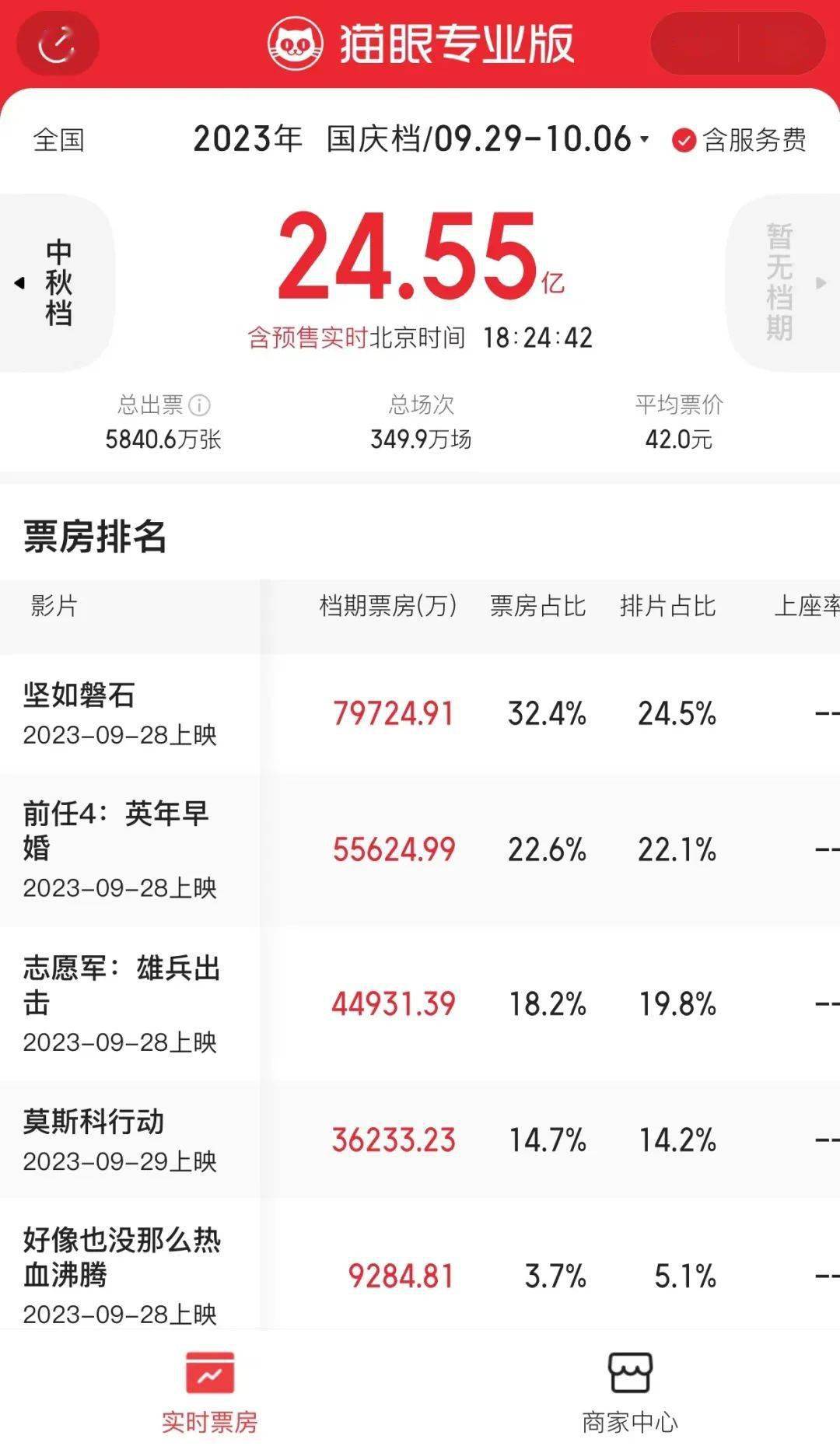 截止目前,2023国庆档档期内总票房(含预售)已突破24亿,《坚如磐石》《前任4:英年早婚》《志愿军:雄兵出击》暂居当前档期票房前三位。