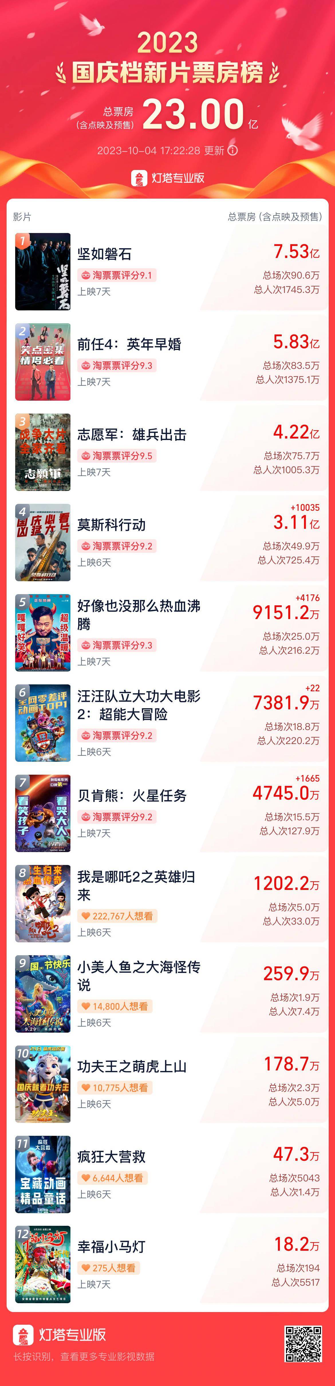原标题:国庆档票房突破23亿 《坚如磐石》暂居榜单首位
