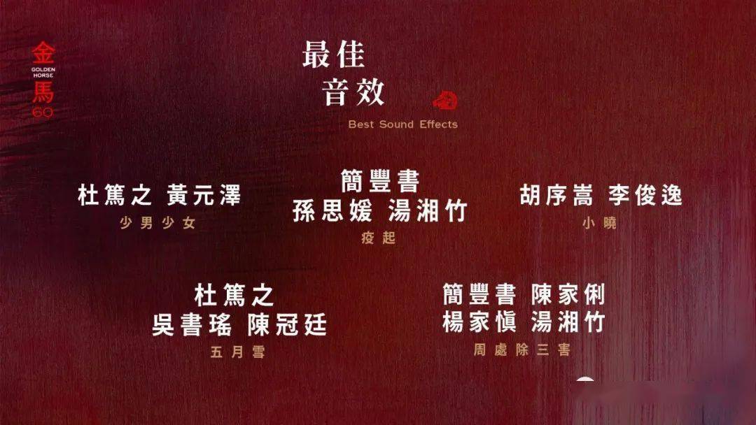 第60届金马奖评审作业分为初选、复选、决选三阶段进行,评审团阵容涵盖了幕前幕后杰出专业人士与学者,最终得奖名单将由李安率领的决选评审团于颁奖典礼当天开会选出,完整评审名单预计10月中旬择期公布。