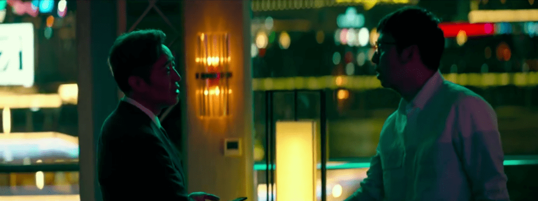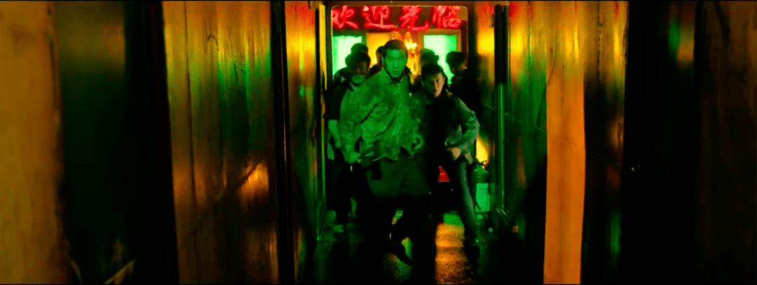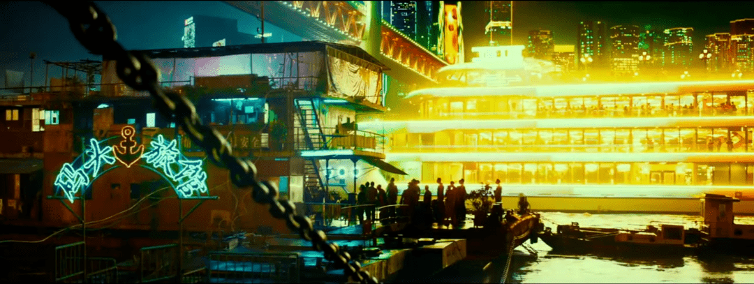 两个小时的影片中几乎没有呈现白天的金江。大事件都发生在夜色中,昏暗的船舱、狭窄的街道、肮脏的泥水、鱼龙混杂的码头……另一面,各种色彩的霓虹灯光又不断闪烁,烘托出光怪陆离的氛围。让观众感到眼花缭乱的同时,更有意打造出另一重世界。