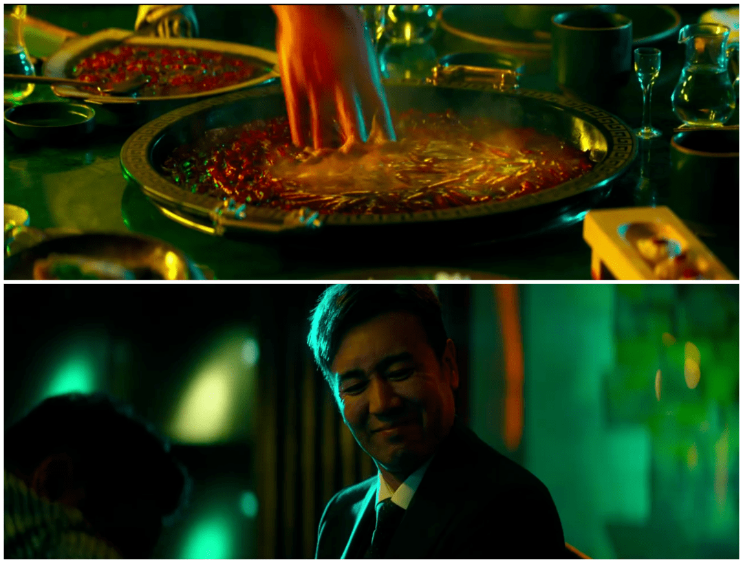 一个打错的外卖电话就能让他瞬间清醒,意识到自己被出卖、被背叛,有人要对他杀之而后快,对于这个极其残暴的人物来说,卧榻之侧岂容他人鼾睡,这一场反杀戏,将色彩运用到极致。