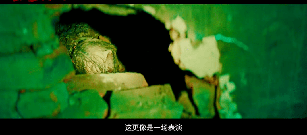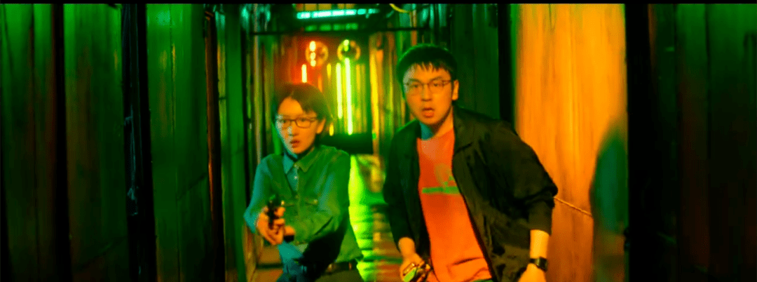 他手握棒棒,站在洗手间顶上,俯视门口来人,头顶的玻璃窗是极高大楼和建筑自带的蓝绿色灯光,中间段是房屋内幽暗的黄色灯光,光线慢慢过渡下来又有些暗红色。黎志田的脸上则闪着幽暗的蓝绿光,带着一些鬼魅、魔鬼的恐怖色彩。