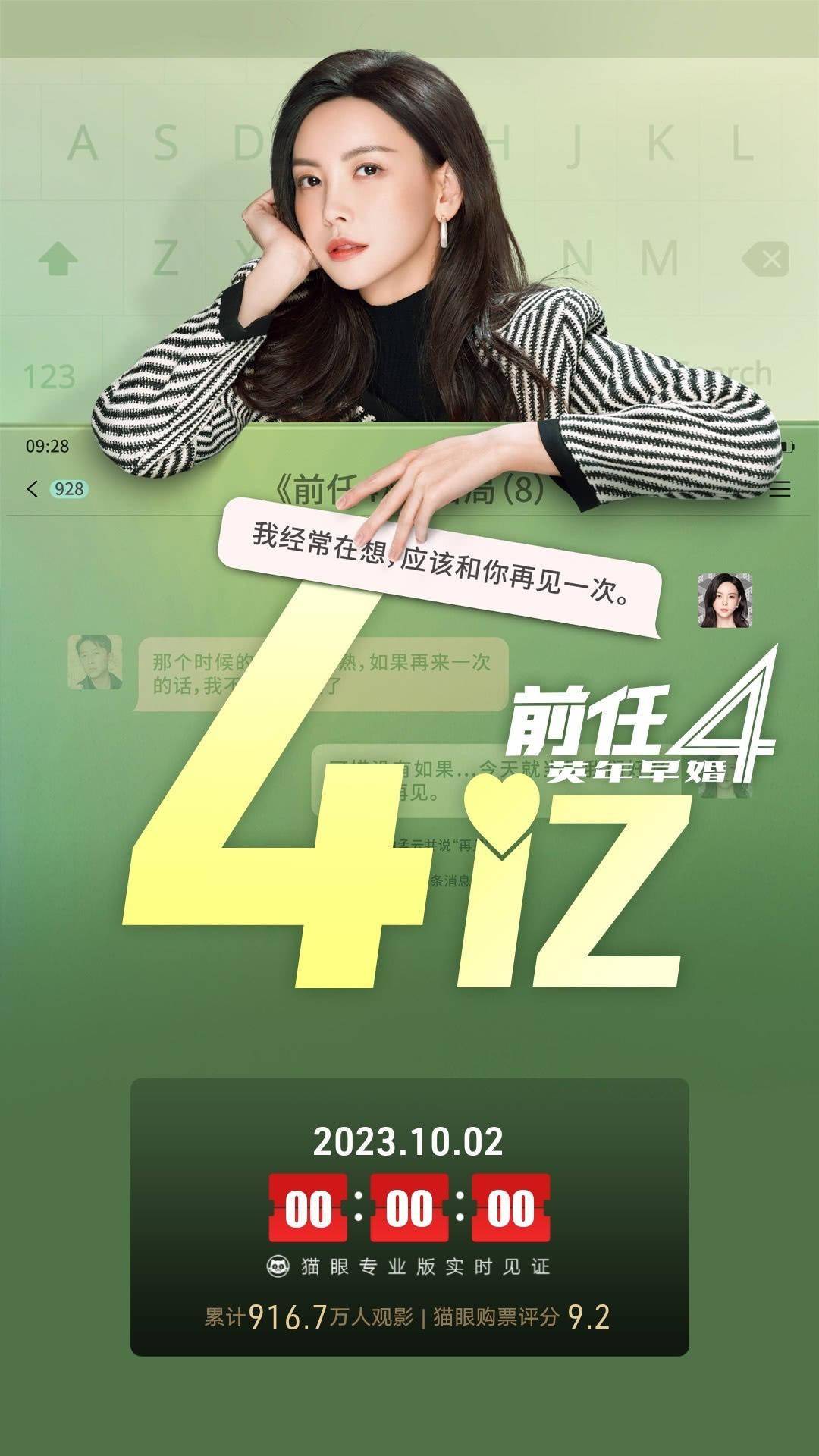 由执导,、、等主演的系列爱情喜剧《前任4》,再次凭借高话题讨论度,吸引观众走进影院。10月2日零时,该片累计票房突破4亿。映前《前任4》“想看人数”破百万,但从目前走势上看,其表现有些疲软。影片9月28日开画,首日票房达9147万,夺得当日票房冠军,但上映次日,便被《坚如磐石》反超。截至10月2日17时,单日票房又被《志愿军:雄兵出击》反超。