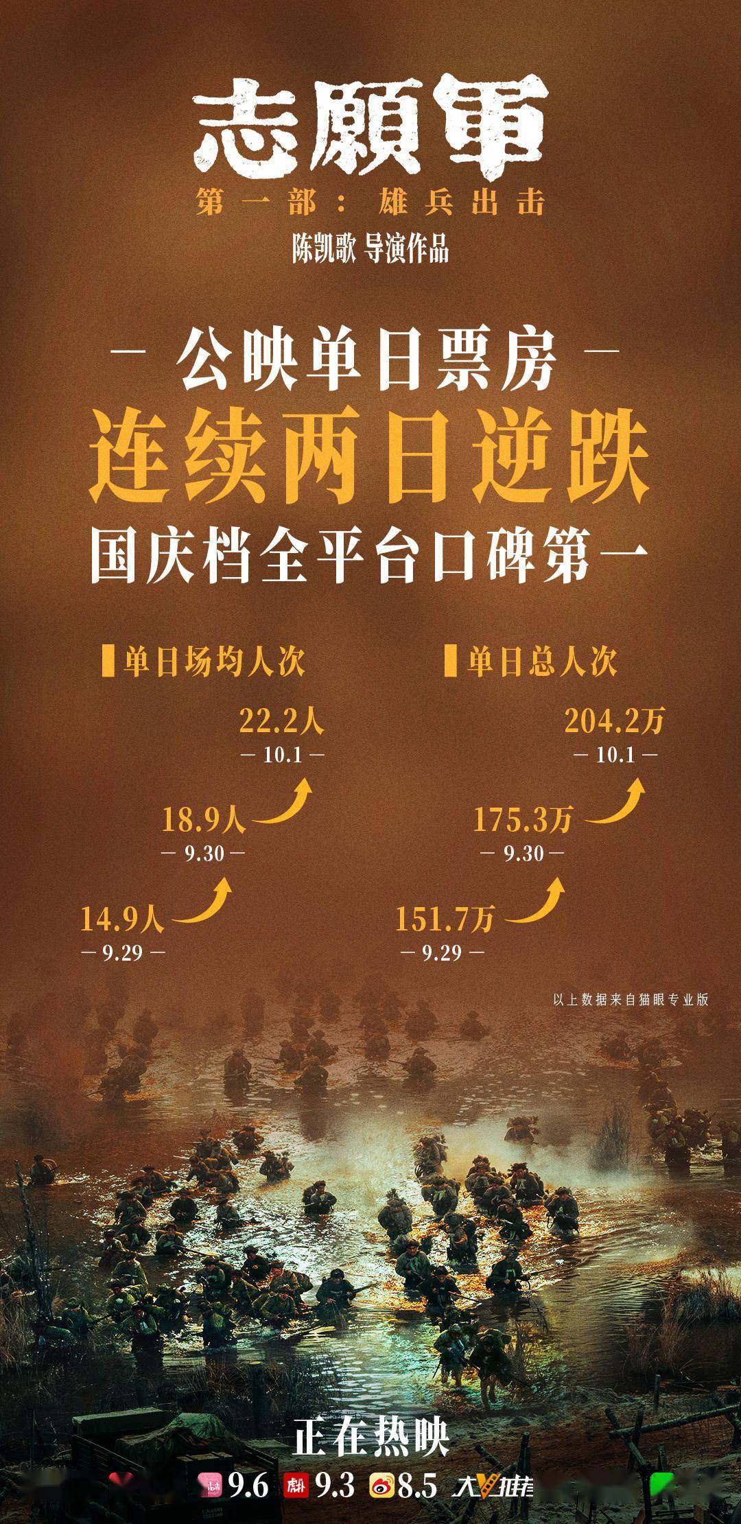 陈凯歌执导的《志愿军》三部曲以全景式呈现、多维度立体讲述抗美援朝战争从决策出兵、到结束战争这一完整过程。作为系列第一部,《志愿军:雄兵出击》口碑爆棚,目前位列国庆档全平台口碑第一,票房连续2日逆跌。该片目前累计票房达2.93亿,位列2023国庆档新片票房榜第三位。