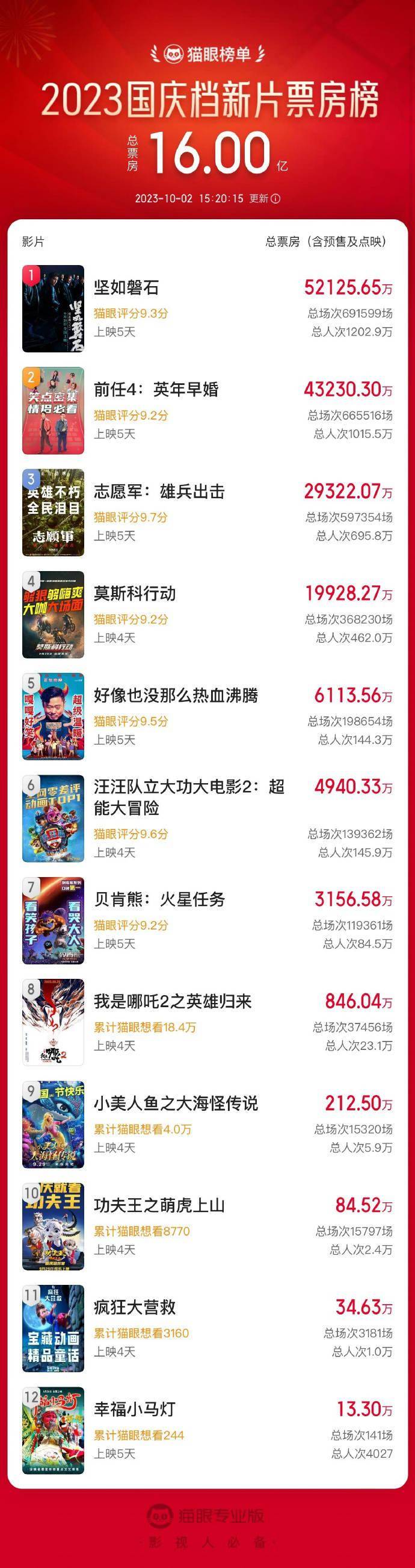 原标题:2023国庆档票房破16亿 张艺谋《坚如磐石》领跑