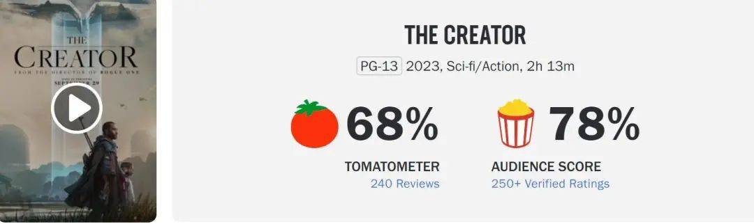 《哥斯拉》导演加里斯·爱德华斯导演的这部科幻片,讲述人工智能在未来成为毁灭人类的力量,但影片上映后没沾到今年AI热潮的红利,调查显示78%的北美观众年龄在25岁以上。影片在烂番茄新鲜度也一降再降,目前新鲜度为68%,观众爆米花指数也才78%。