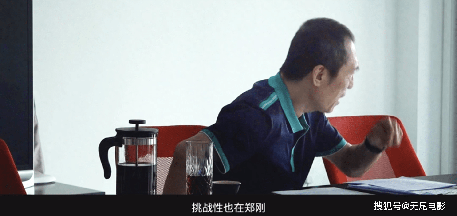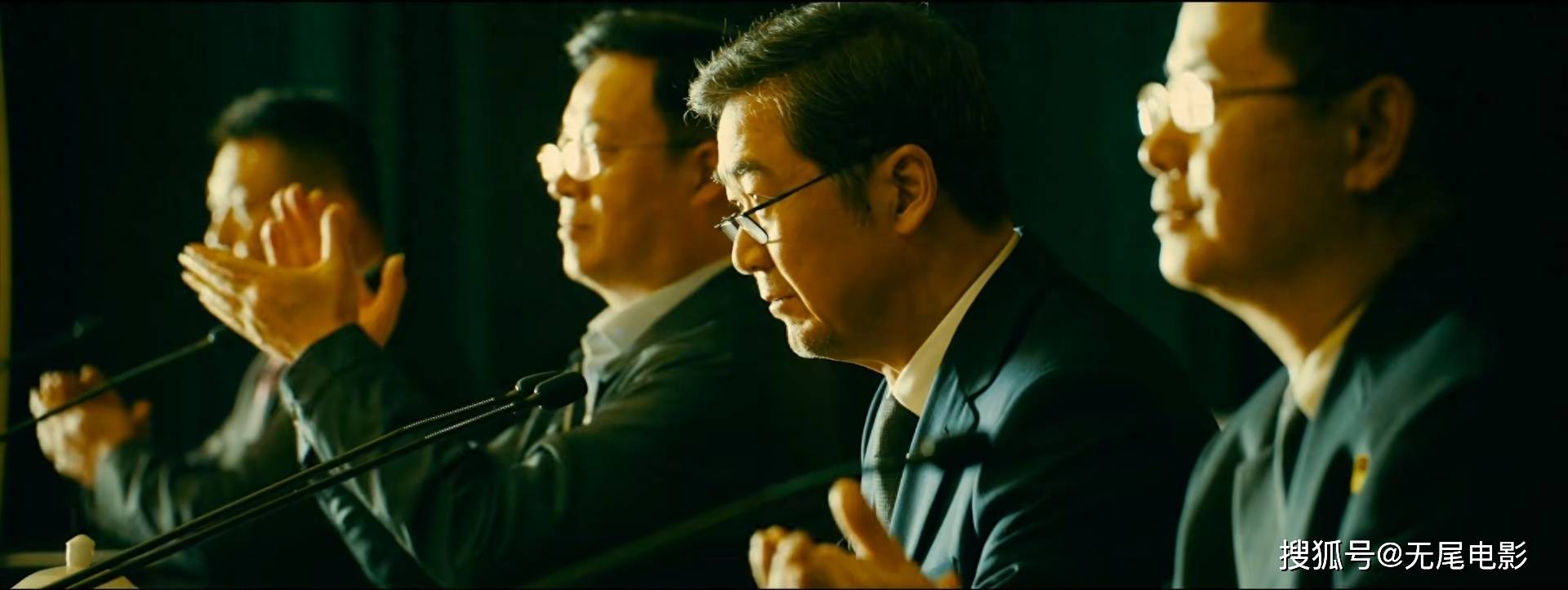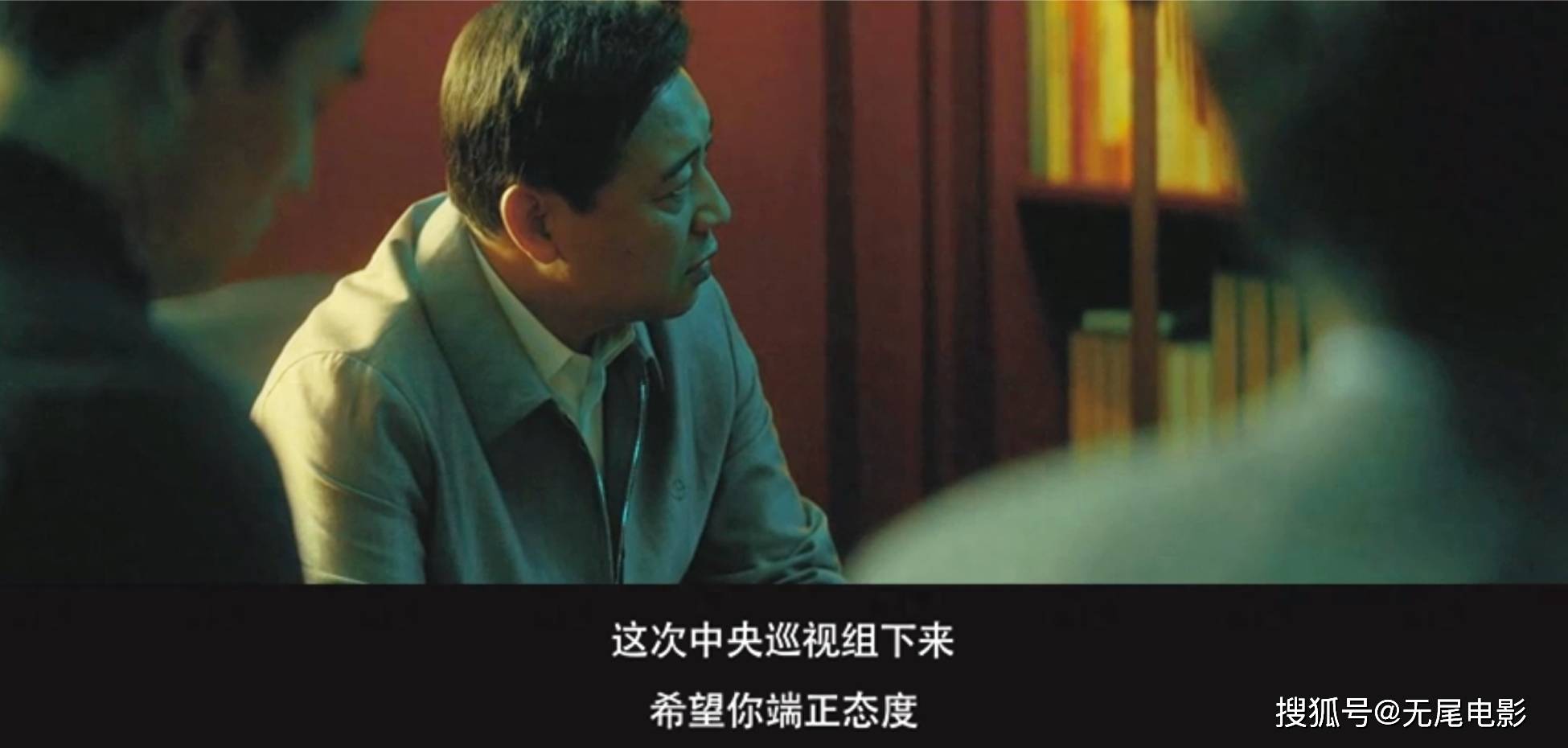 从这个镜头可以看出,他坐在主席位,公映版里的刘波则坐在一旁。