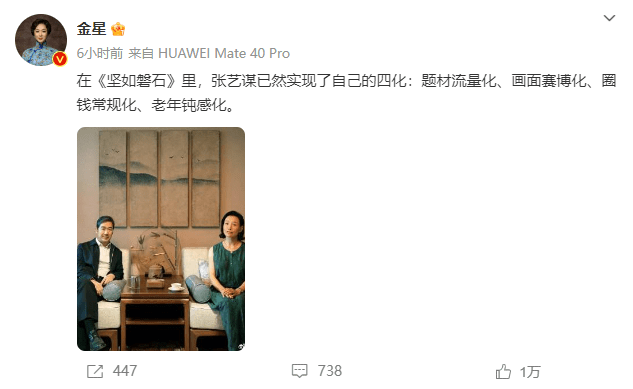10月2日凌晨,金星通过自己的社交媒体平台,对张艺谋导演的《坚如磐石》金星差评: