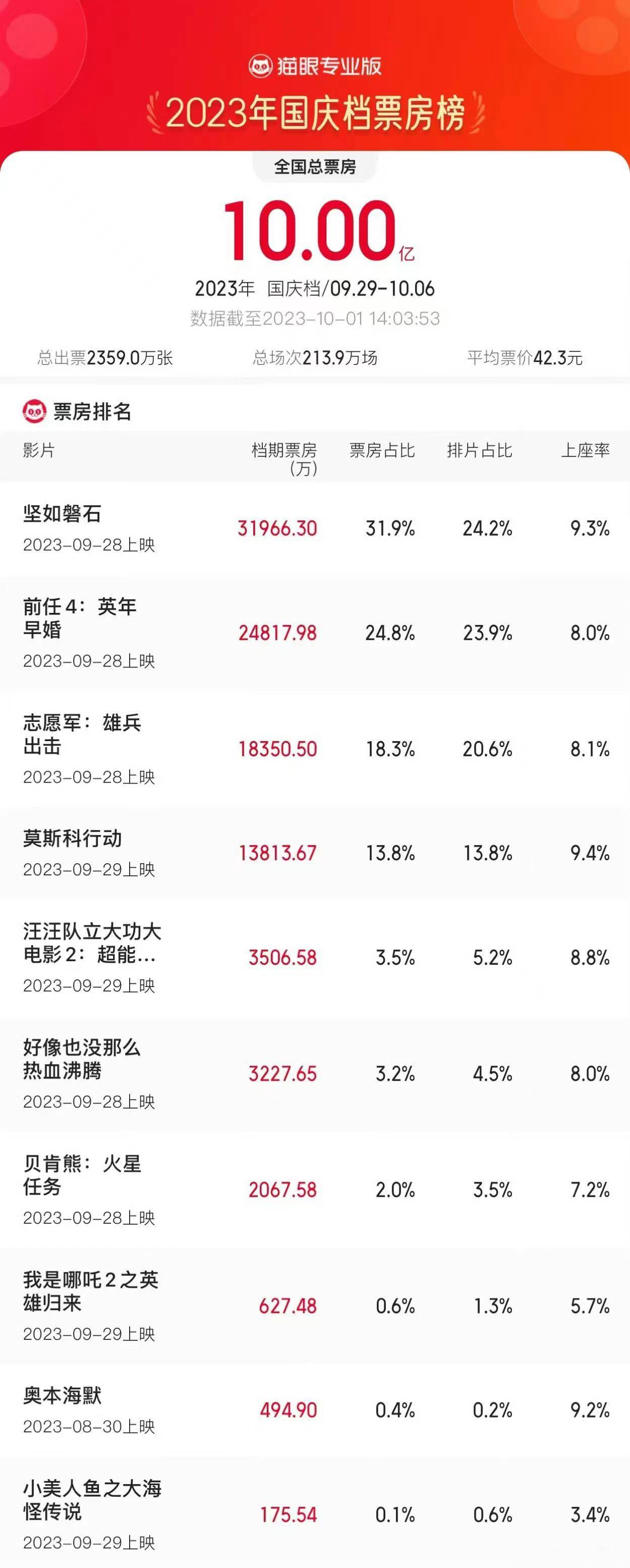 原标题:国庆档票房突破10亿 《坚如磐石》《前任4》领先