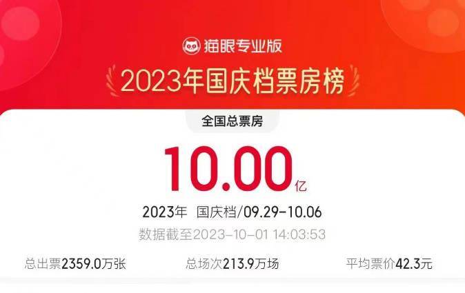 1905电影网讯据猫眼专业版数据显示,截至10月1日14时03分,2023年国庆档(9月29日-10月6日)累计票房突破十亿。电影位居票房榜前三位。今年国庆档上映的影片类型丰富,涵盖战争、动作、喜剧、悬疑、动画等多种类型题材,满足不同人群的观影需求。