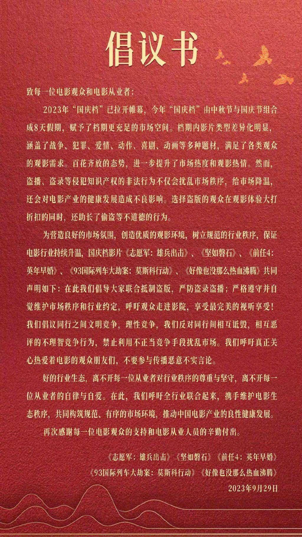 1905电影网讯 2023年国庆档火热开启,热闹非凡,共12部新片上映,电影市场生机勃勃。日前,国庆档5部新片 联合发布声明,倡导大家抵制盗版,严防盗录盗播,倡议文明竞争,理性竞争,反对相互诋毀、相互恶评的不理智竞争行为。