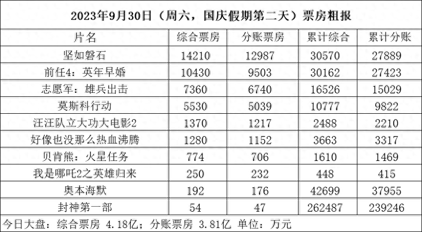 9月30日(国庆假期第二天),全国共排映45.2万场,观影人次约979万,根据初步统计产出票房4.18亿