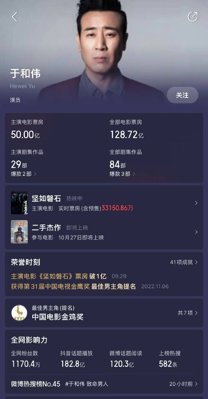 原标题:于和伟主演电影票房破50亿 主演犯罪悬疑片《坚如磐石》正在热映