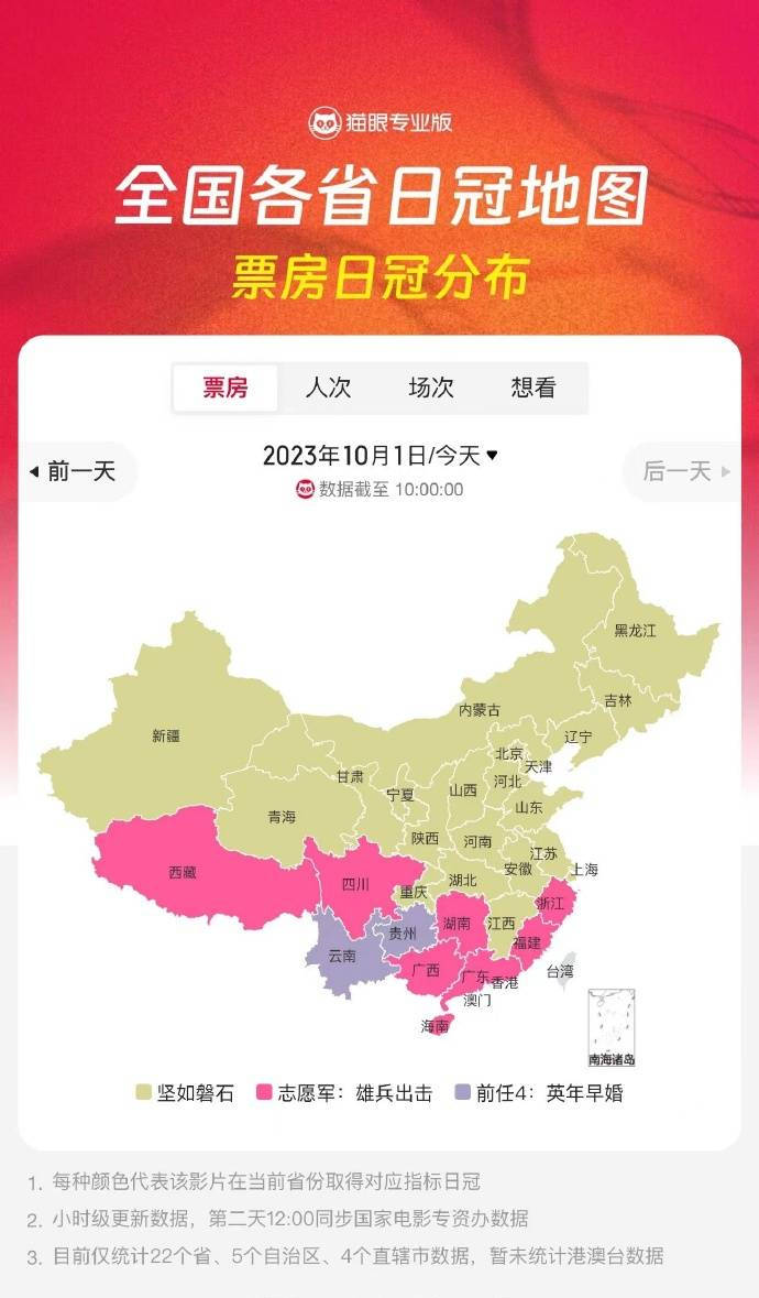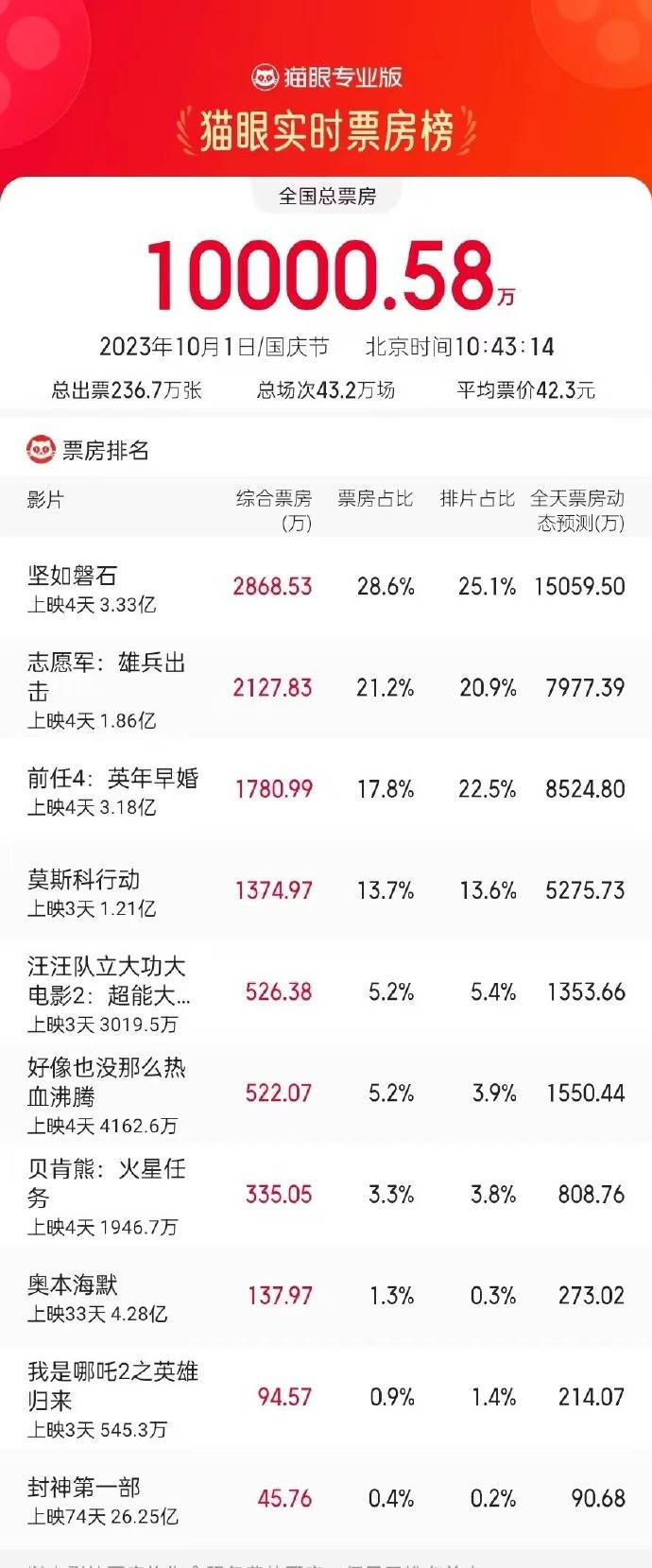 原标题:2023国庆节单日票房破亿 《坚如磐石》《志愿军》《前任4》分列前三