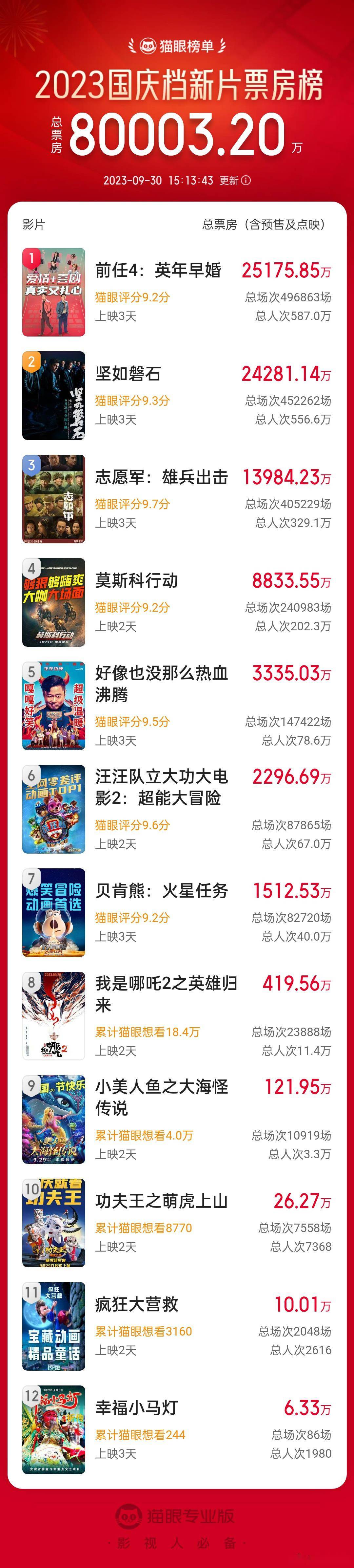 1905电影网讯 据猫眼专业版数据显示,截至9月30日15时13分,2023年国庆档新片票房榜(含点映及预售)破8亿。分别以2.51亿、2.42亿、1.39亿的票房暂列前三位。国庆档电影分别暂居第四、第五。