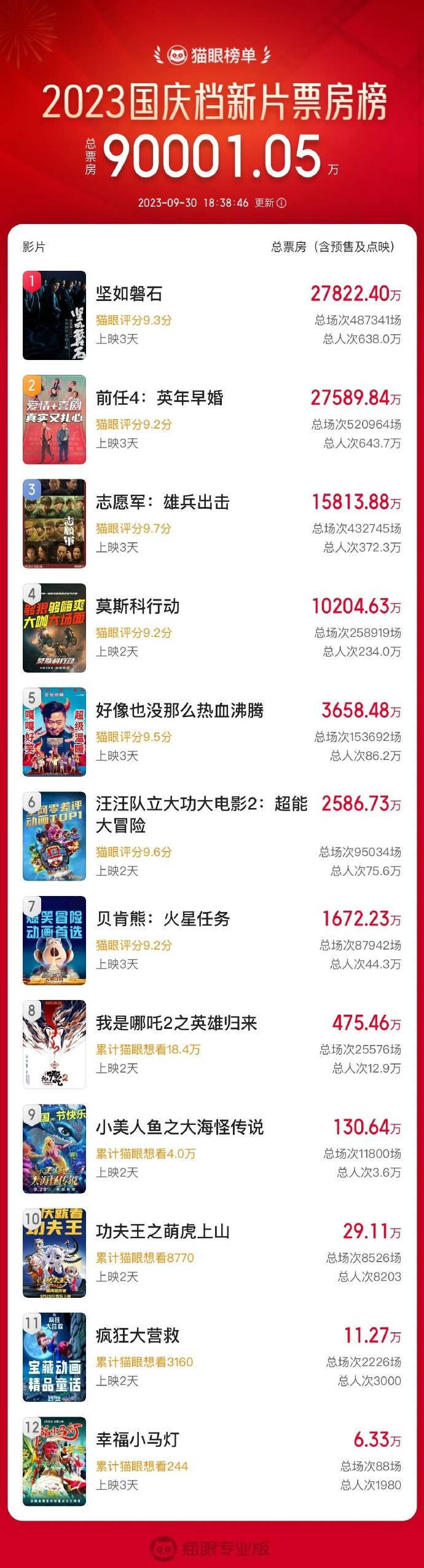 搜狐娱乐讯 据猫眼专业版数据,截至9月30日18时38分,2023年国庆档新片票房榜(含点映及预售)破9亿。其中,电影《坚如磐石》总票房(含预售)破2.782亿,超《前任:英年早婚》票房,登顶2023国庆档新片票房榜!