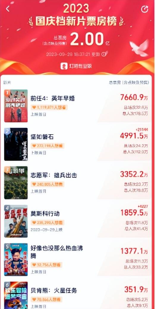 更意外的是,不算很出名的导演的作品《前任4》,之前的口碑评价一直不好,票房成绩却不算太差,所以一直在拍续集。而且这次与它竞争的,既有张艺谋的《坚如磐石》,也有陈凯歌的《志愿军》,导演都是顶级大导演,比年轻导演名气大很多,而且一部有不错的口碑,一部是主旋律大制作,在这样的情况下,《前任4》居然还能参与票房竞争,而且目前看来甚至还领先,也是让人很意外的。