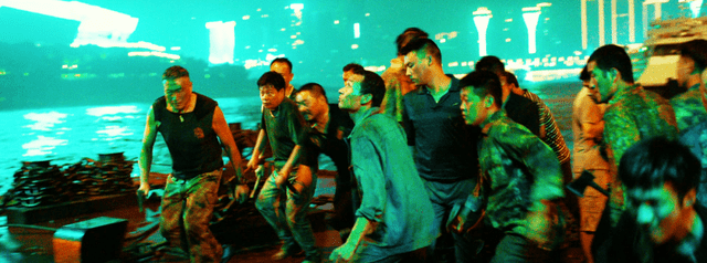 轮船大战那场戏,代表冷兵器的斧头砍刀,和代表热兵器的手枪,在狭窄逼仄的船上叮当作响。