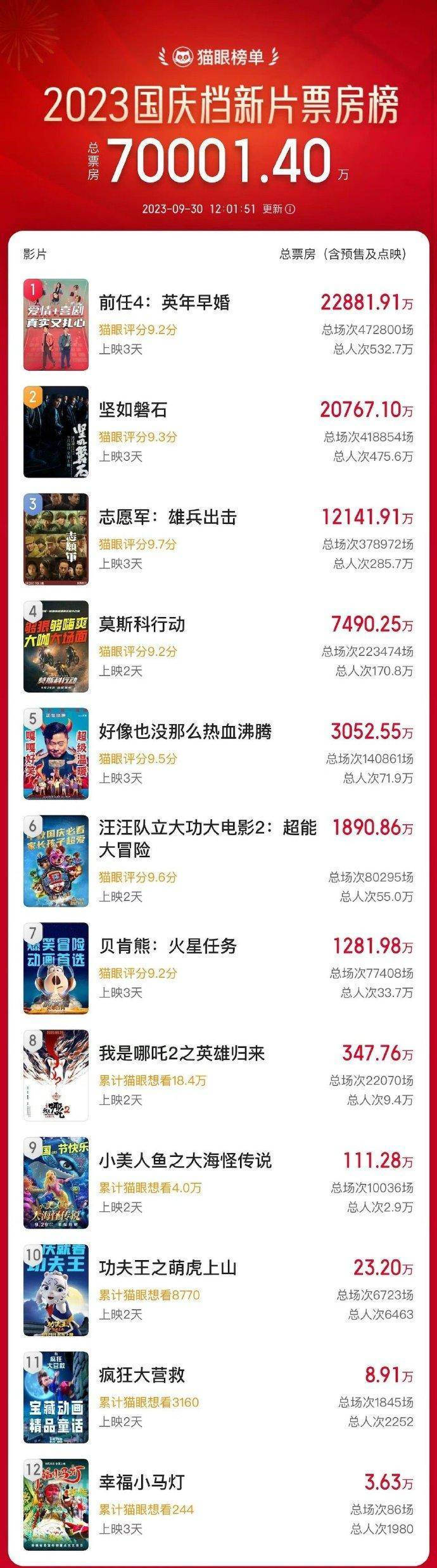 搜狐娱乐讯 30日,据猫眼专业版,截至9月30日12时01分,2023年国庆档新片票房榜(含点映及预售)破7亿,《前任4》、《坚如磐石》领跑。