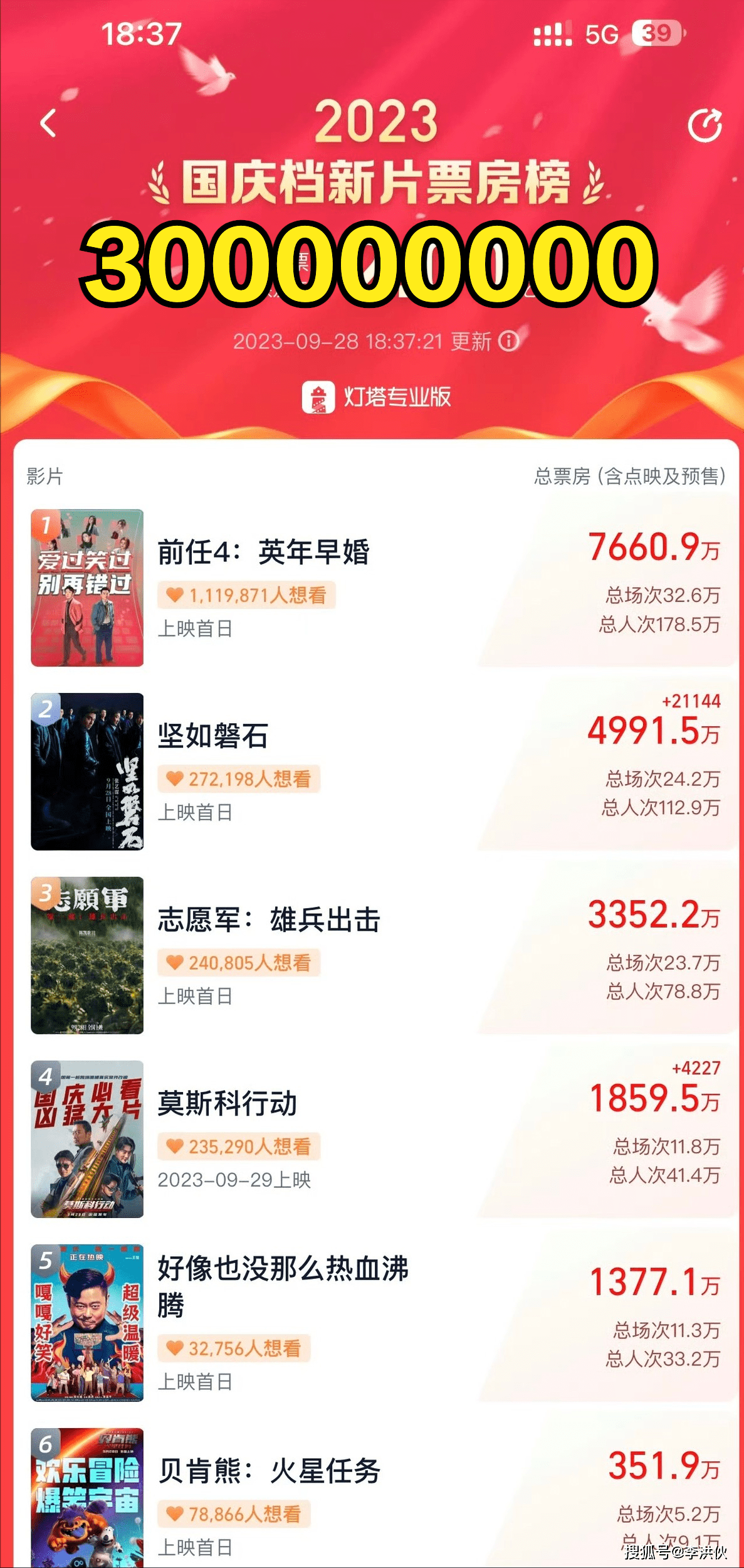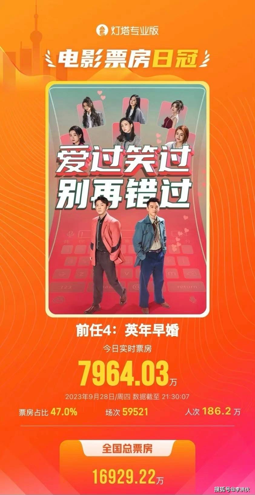 根据灯塔专业版实时数据,截至9月28日21时,影片《前任4:英年早婚》上映首日以7964完好成绩成为单日票房冠军,打响了2023国庆档票房混战第一枪。