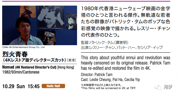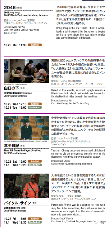 今年东京电影节在此单元下设香港电影展映单元,五部香港电影入围,分别是 《2046》《年少日记》《白日之下》《送院途中》《烈火青春》。