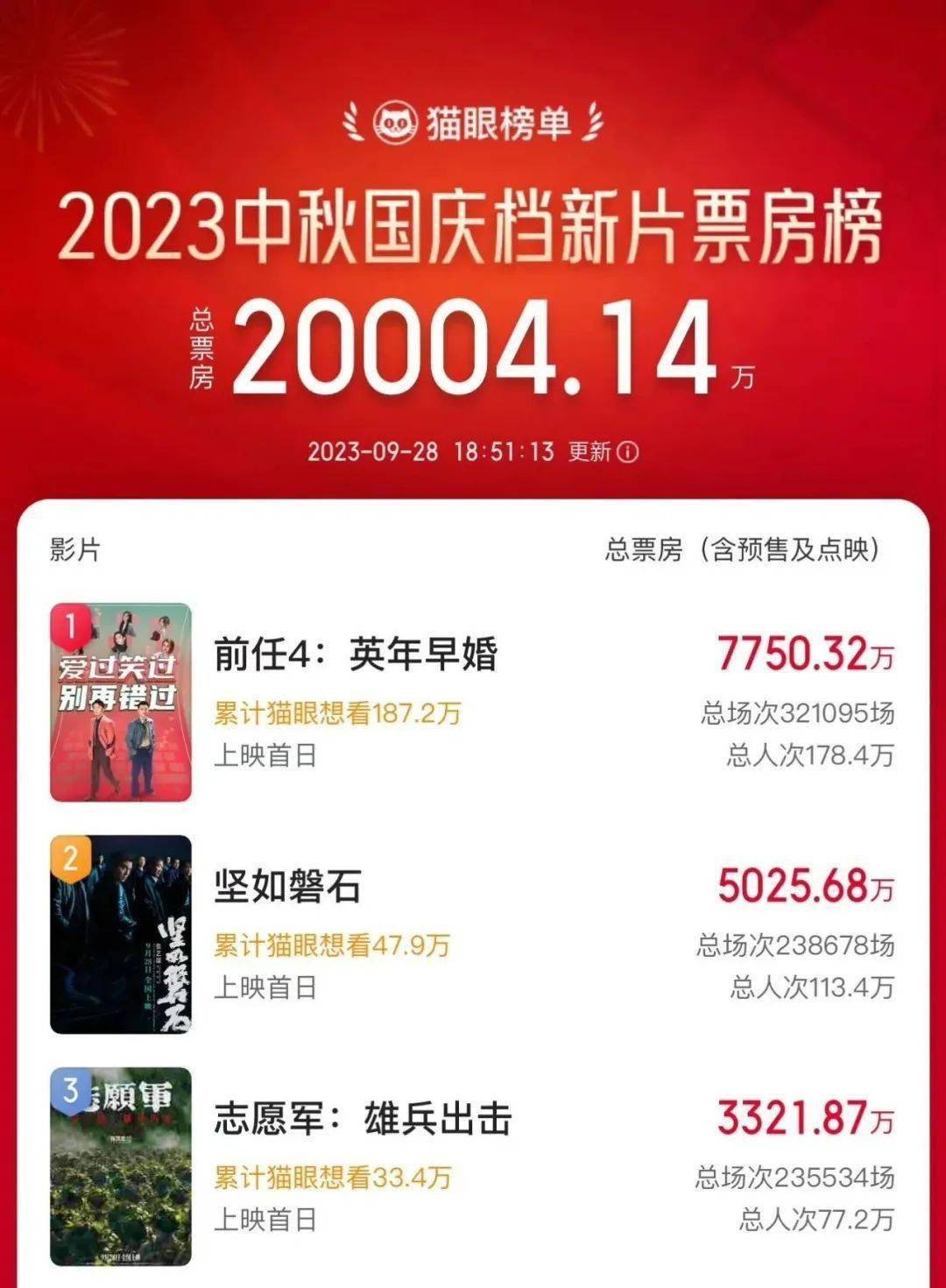 据猫眼专业版数据,截至9月28日18时51分,2023年中秋国庆档新片票房榜(含点映及预售)破2亿,《前任4:英年早婚》《坚如磐石》《志愿军:雄兵出击》分列票房榜前三位。