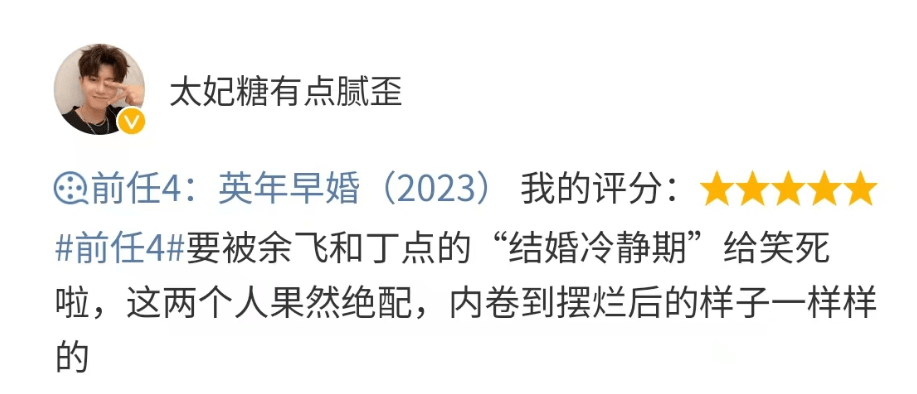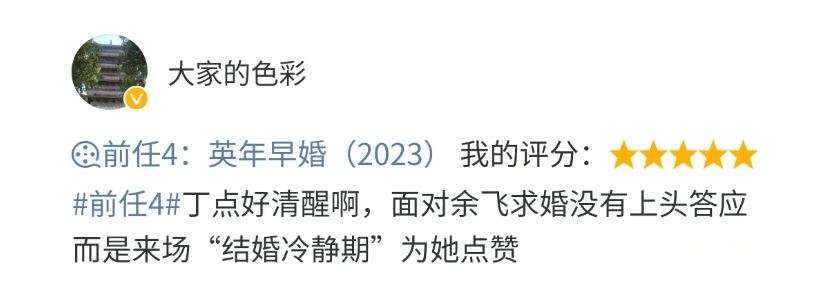 除此之外,《前任4》给观众的一个很大惊喜就是它对恋爱和婚姻的过渡过程进行了深刻的探讨,为此还意外创造了一个准爆梗——“结婚冷静期”。