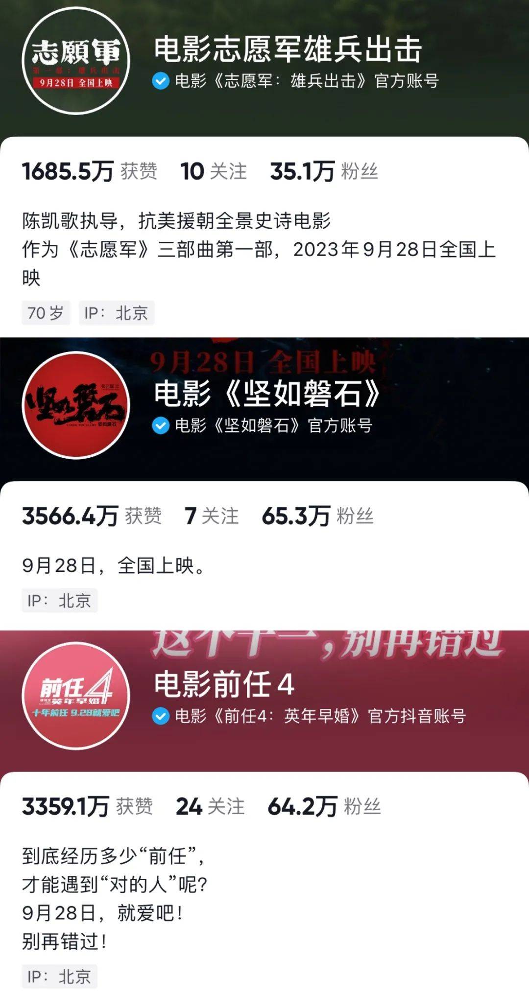 这样的结果,其实从几部影片的官方账号就能找到线索。