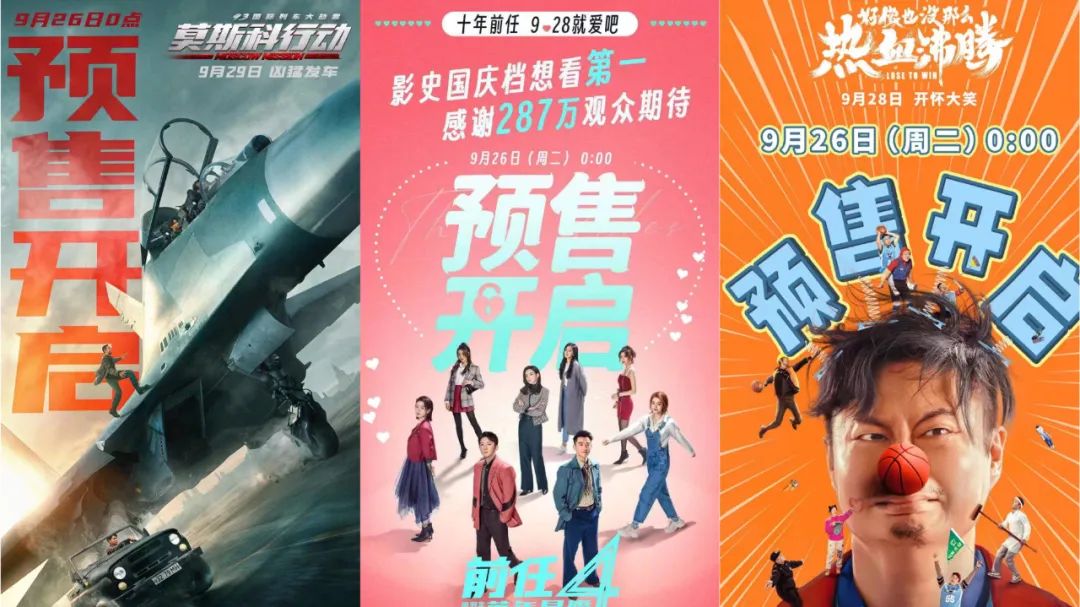 由于预售时间极短,截至发稿前,中秋国庆档的预售成绩刚刚过亿,但难以企及2019年的3.66亿。目前《前任4》断层领先,预售票房超过3000万,也是9月28日全国所有省份的预售冠军。《坚如磐石》《志愿军》分列第二、第三,都在1500万以上,而《热血沸腾》与《莫斯科行动》则在1000万左右。