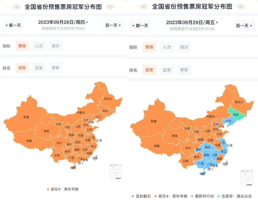 等到29日五片混战之时,预售格局有些变动,除个别省份外,东部沿海几省的预售冠军都是《莫斯科行动》,仅北京一地由《坚如磐石》夺冠,吉林则是《志愿军》拔得头筹,其他地区仍是《前任4》领先。