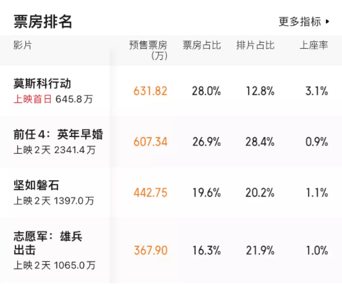 影城经理近年来也会依据想看数据来排片,因此即使有不成文的规定,猫眼专业版显示的首日(9月28日)排片也是《前任4》独自位于第一梯队。到了《莫斯科行动》加入战场的9月29日,形势更加明显,《前任4》占比28%,《志愿军》和《坚如磐石》分别占比22%和20%,《莫斯科行动》占比12.8%。